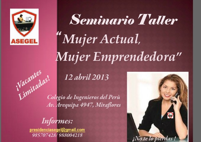 Seminario Taller: “Mujer Actual, Mujer Emprendedora” Viernes 12 abril 2013 Nombre: Mujer Actual, Mujer Emprendedora Fecha: 12 abril 2013 Lugar: Colegio de Ingenieros del Perú. Descripción: La Asociación de Secretarias Ejecutivas y Asistentes de Gerencia de lima – ASEGEL ,…
